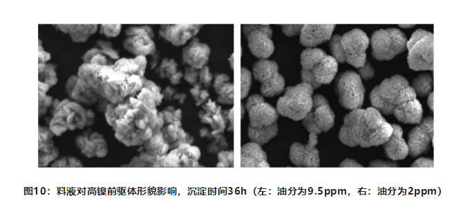 在實際生產(chǎn)過程中,少量的有機溶劑會對共沉淀反應(yīng)造成很大困擾,而鎳鈷錳原料提純過程中會用到有機溶劑,少量的有機溶劑會帶到前驅(qū)體的反應(yīng)中。料液油分越高,振實密度越低,前驅(qū)體的形貌變得疏松,無法成球,造成顆粒無法生長,粒度分布寬化。